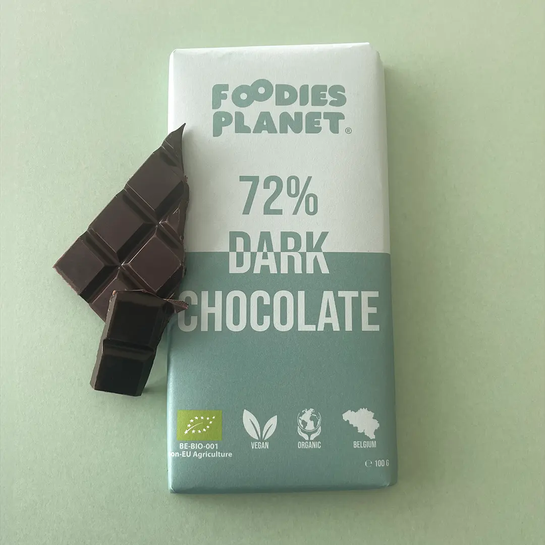 Die 72 % Dunkle Schokolade von Foodies Planet überzeugt durch ihren kräftigen, reinen Kakaogeschmack. Hergestellt in Belgien aus hochwertiger Bio-Kakaomasse und Rohrzucker, bietet sie intensiven Schokoladengenuss ohne Kompromisse.