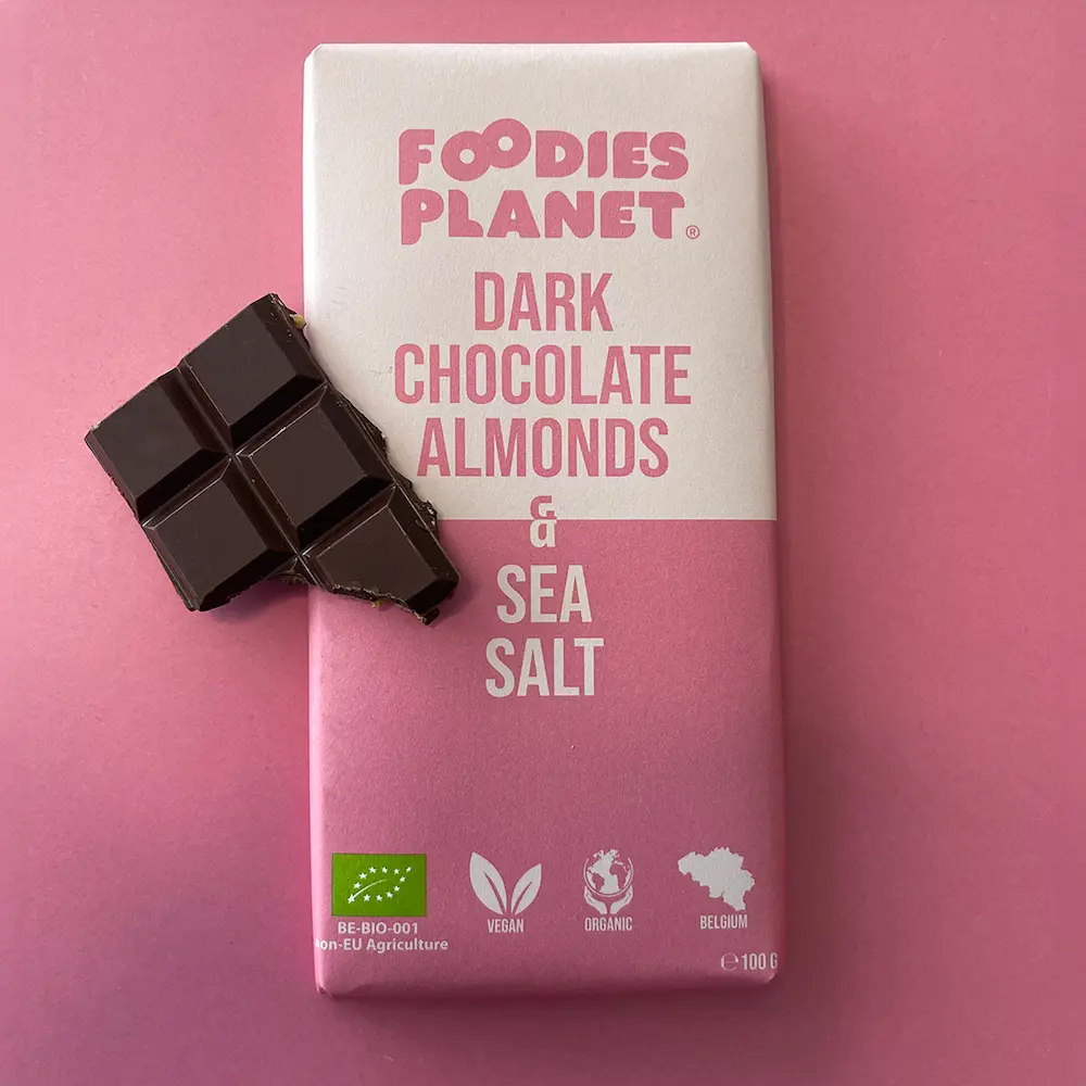 Die Dunkle Schokolade mit Mandeln und Salz von Foodies Planet vereint intensiven Kakaogeschmack mit knusprigen, gerösteten Mandeln und einer dezenten Prise Meersalz. Perfekt für alle, die süß und salzig lieben.