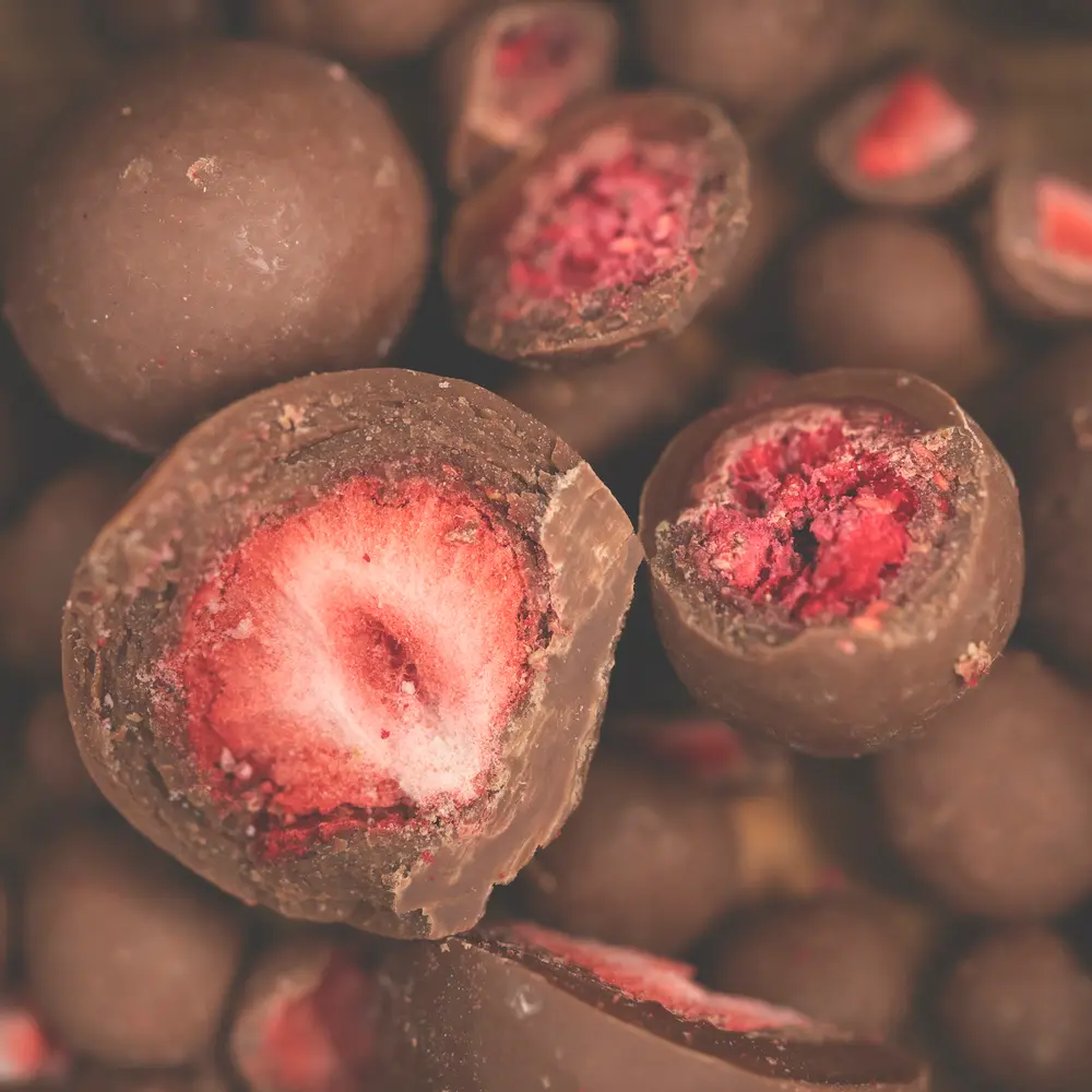 Unsere Rohschokolade basiert auf hochwertigen Criollo-Kakaobohnen aus nachhaltigem Anbau und wird bei Temperaturen unter 42 °C verarbeitet. Das traditionelle Steinmahlverfahren verleiht der Schokolade eine samtige Textur, die die Erdbeeren sanft umhüllt und deren Aroma optimal zur Geltung bringt.