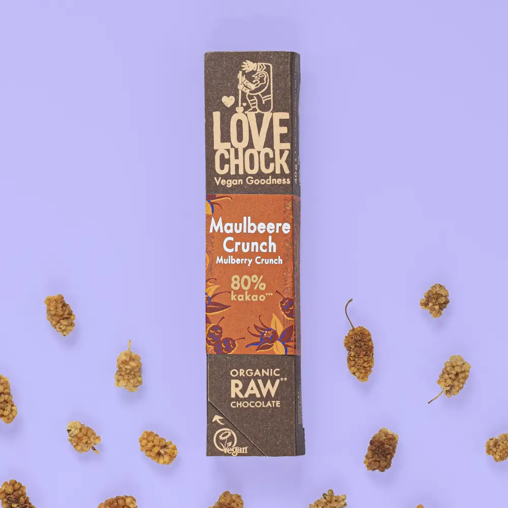 LoveChock Maulbeere Crunch – vegane Rohschokolade mit fruchtigen Maulbeeren und knusprigem Crunch.