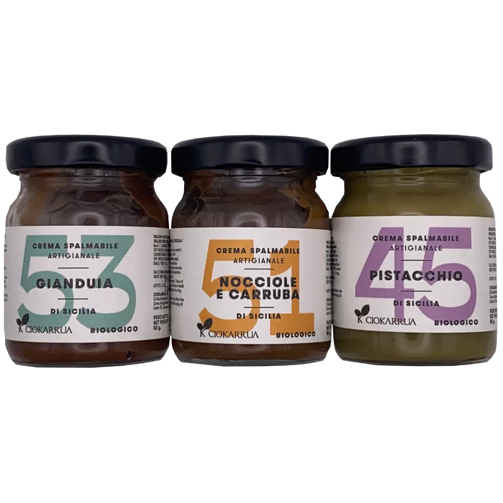Das Schokoaufstriche Probierpaket von Ciokarrua vereint drei sizilianische Spezialitäten: Pistazie mit 45 %, Haselnuss-Carruba mit 51 % und Gianduia mit 53 % Haselnüssen. Jede Sorte liefert ein einzigartiges Aromaerlebnis.
